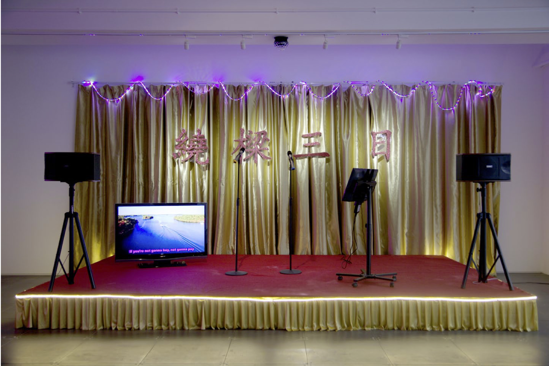 Dual channel video, audio set, red carpet, gold drapes, foam lettering, LED lights, disco ball
